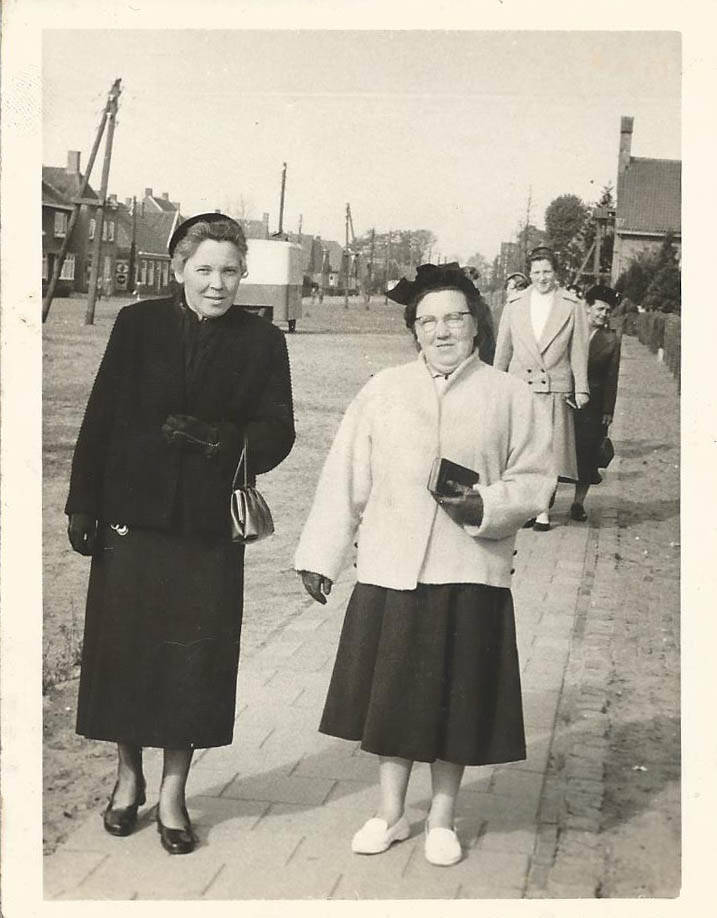 Betsie van Krugten van Spijk (rechts) met buurvrouw Anna Samuels op weg naar de Kerk
