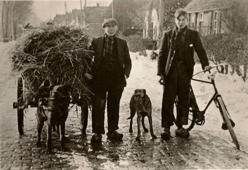 Gijs van Krugten (1922-1982) met hondenkar en Jos de Vaan in de Haarsteegsestraat.